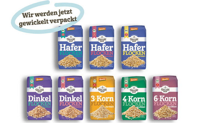 Neben den Haferflocken werden weitere Flocken-Produkte, wie Dinkelflocken oder 3-, 4-, oder 6-Korn Flocken in den nächsten Wochen umgestellt. Mit der Anpassung aller Verpackungen auf ein einheitliches Format können wir unsere Produktion noch effizienter und grüner gestalten sowie die Logistikabläufe optimieren.