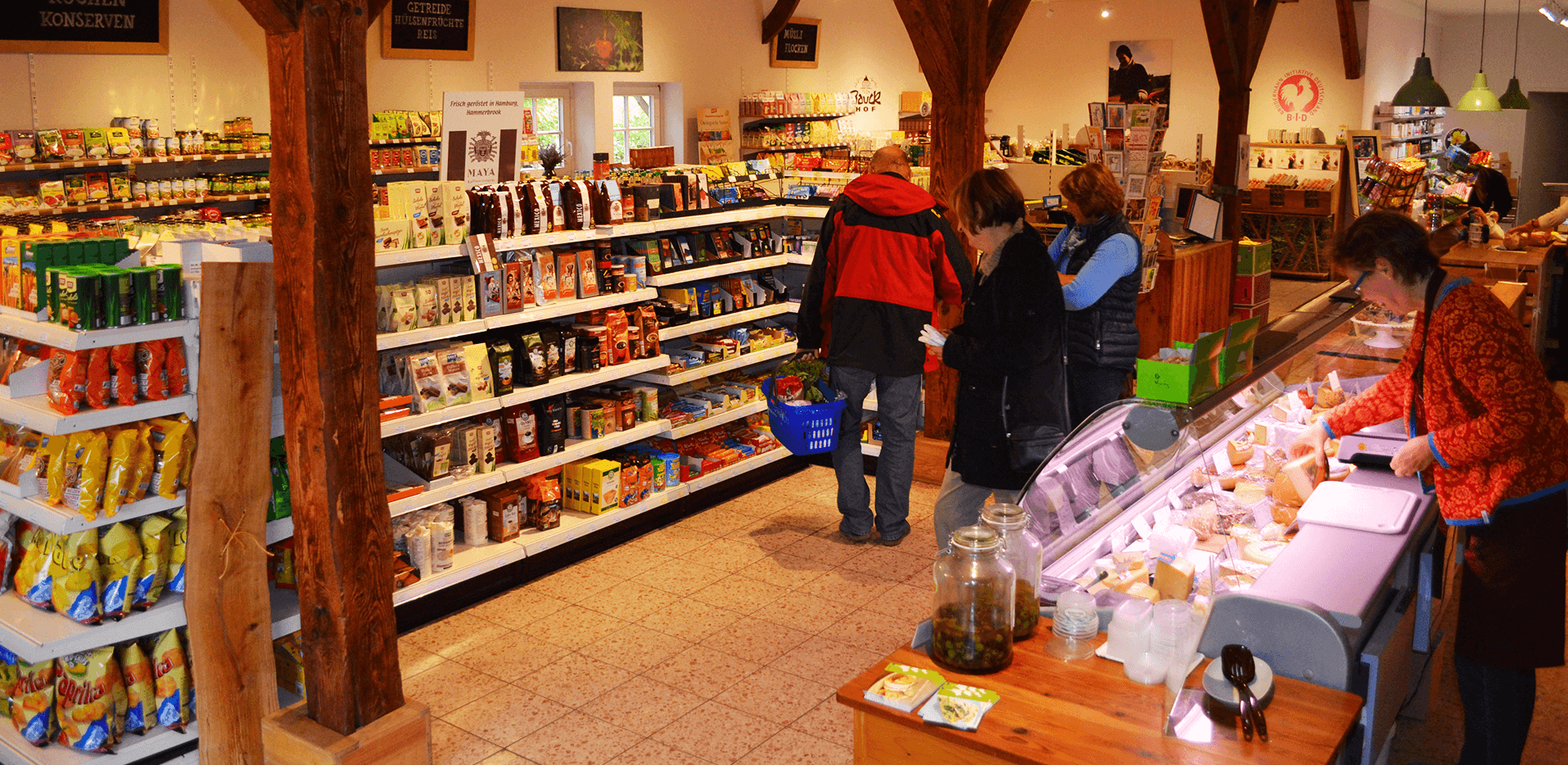 Unser Hofladen in Amelinghausen bietet ein Vollsortiment für den Bioeinkauf von A bis Z. Darüber hinaus sind wir das Schaufenster der Bauckhöfe: Wir haben (fast) alle Produkte unserer drei Höfe und der Bauckhof Mühle im Sortiment: von der Kartoffel über das Ei, Fleisch- und Wurstspezialitäten mit Schwerpunkt Geflügel, die Mühlenprodukte wie Mehle, Müslis und Backmischungen sowie saisonales Feld- und Feingemüse und Präsente aus der Bauckhof-Töpferei Stütensen. Eine Besonderheit zu anderen Bioläden ist bei uns in Amelinghausen natürlich die Anbindung zum Hofgeschehen. Dazu die schöne Atmosphäre mit alten Fachwerkelementen, die handwerklich gearbeiteten Präsentationsregale und Kassentheke –gefertigt aus eigener Eiche in der Holzwerkstatt auf dem Bauckhof Amelinghausen.