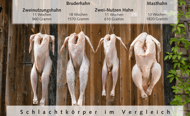 Dieses Foto zeigt deutlich, was die Züchtung aus den Hähnen macht. Links ist ein Zweinutzungshahn der ÖTZ_Zucht, eine sogenannte Gebrauchskreuzung zwischen „Bresshuhn“ und „Whiterock“ zu sehen. Daneben unser Bruderhahn aus der Legehennenzuchtlinie „Lohmann Brown Plus“. Der sogenannte Zwei-Nutzen Hahn der sehr intensiv auf Legeleistung gezüchten Linie „Sandy“ wiegt nur ein Drittel von der ökologisch überall verwendeten Masthuhnlinie „ISA JA75“.